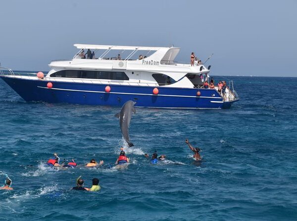 Embark on an unforgettable Dolphin House snorkeling adventure in the Red Sea, where you have a 90% chance of encountering dolphins in their natural habitat. Enjoy a relaxing boat ride, sunbathe on deck, and dive into the crystal-clear waters for three snorkeling stops at vibrant coral reefs teeming with exotic marine life. A delicious onboard lunch is included before heading back to your hotel.